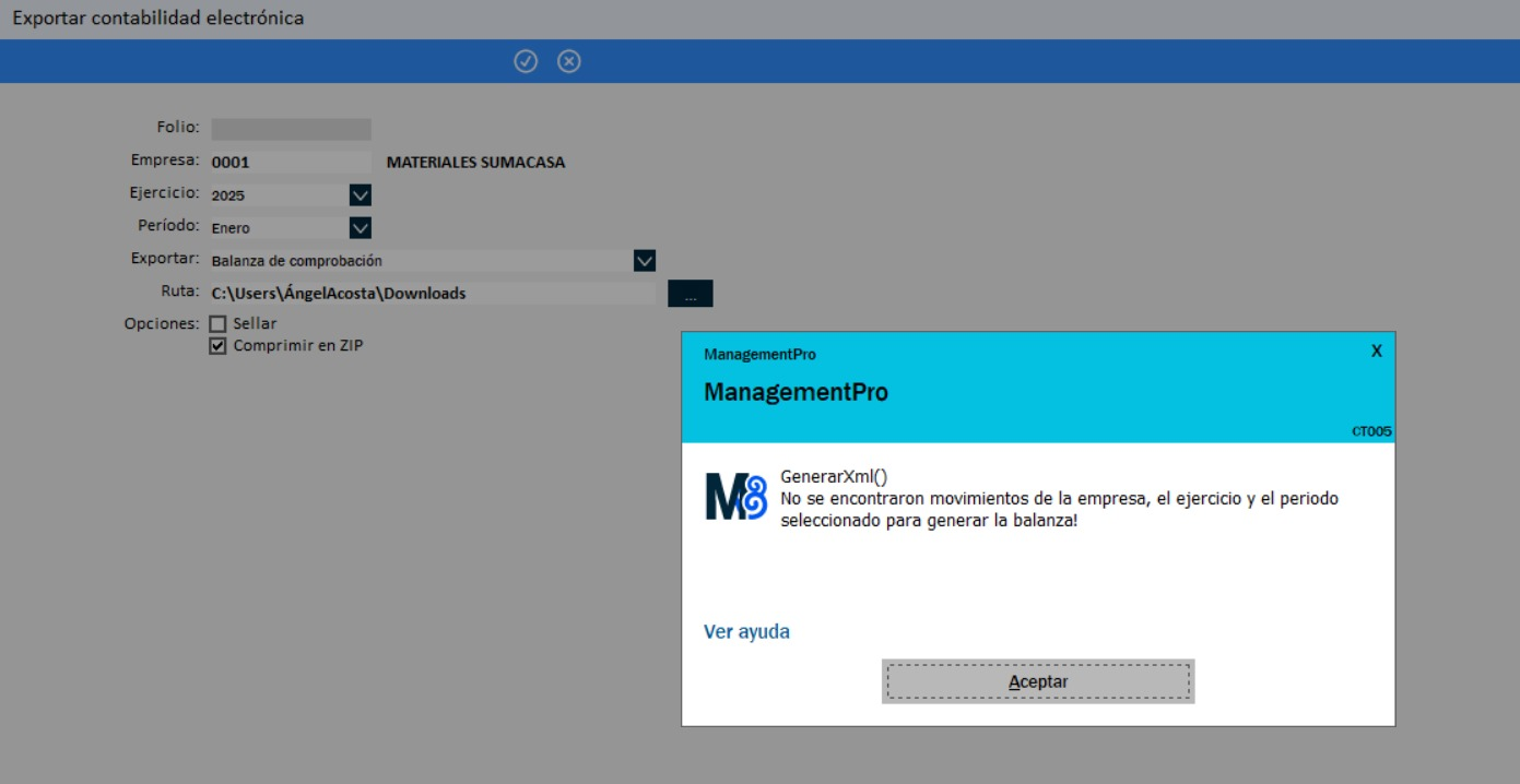 Quisiera saber si cuentan con algún manual o guía para poder utilizar la pantalla CT005 - Exportar contabilidad electrónica, ya que la intentamos realizar pero nos manda un error (Ver imagen).