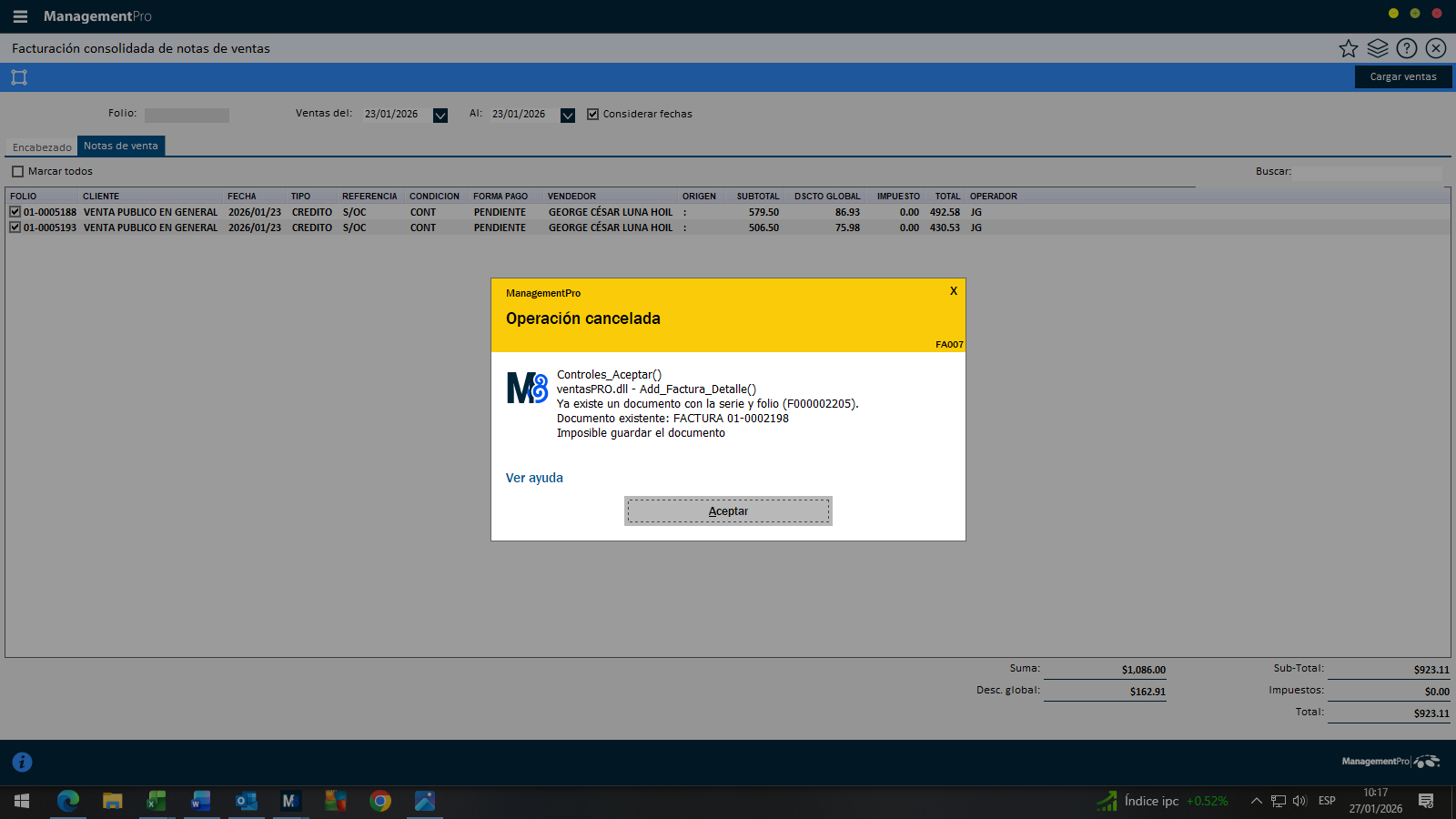 Buenos días....Su apoyo por favor ya que no me permite emitir una factura consolidad de dos notas de venta, me indica el sistema que dicho documento ya están dentro de una factura emitida y si consultas las notas no tiene factura asignada y si consultas la factura corresponde a trop cliente y productos, anexo imagen:
