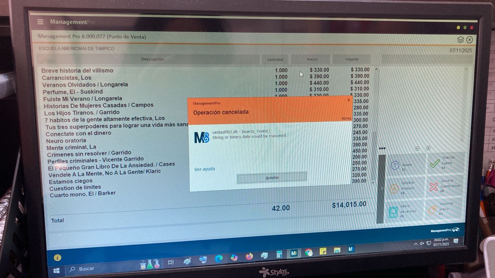 Literalia Librerias Nov 7 Literalia Librerias RETAIL ERROR punto de venta No me deja continuar, ¿qué hago? Me gusta Axel Díaz Nov 7 ¡Hola! Bienvenido al soporte técnico de ManagementPro :tada: Es un gusto atender tu consulta. Estamos aquí para resol... Ver mas Me gusta Axel Díaz Nov 7 Que tal Literalia, te comento que ya nos hemos contactado con el número provisto para verificar el tema, siendo que se d... Ver mas Me gusta