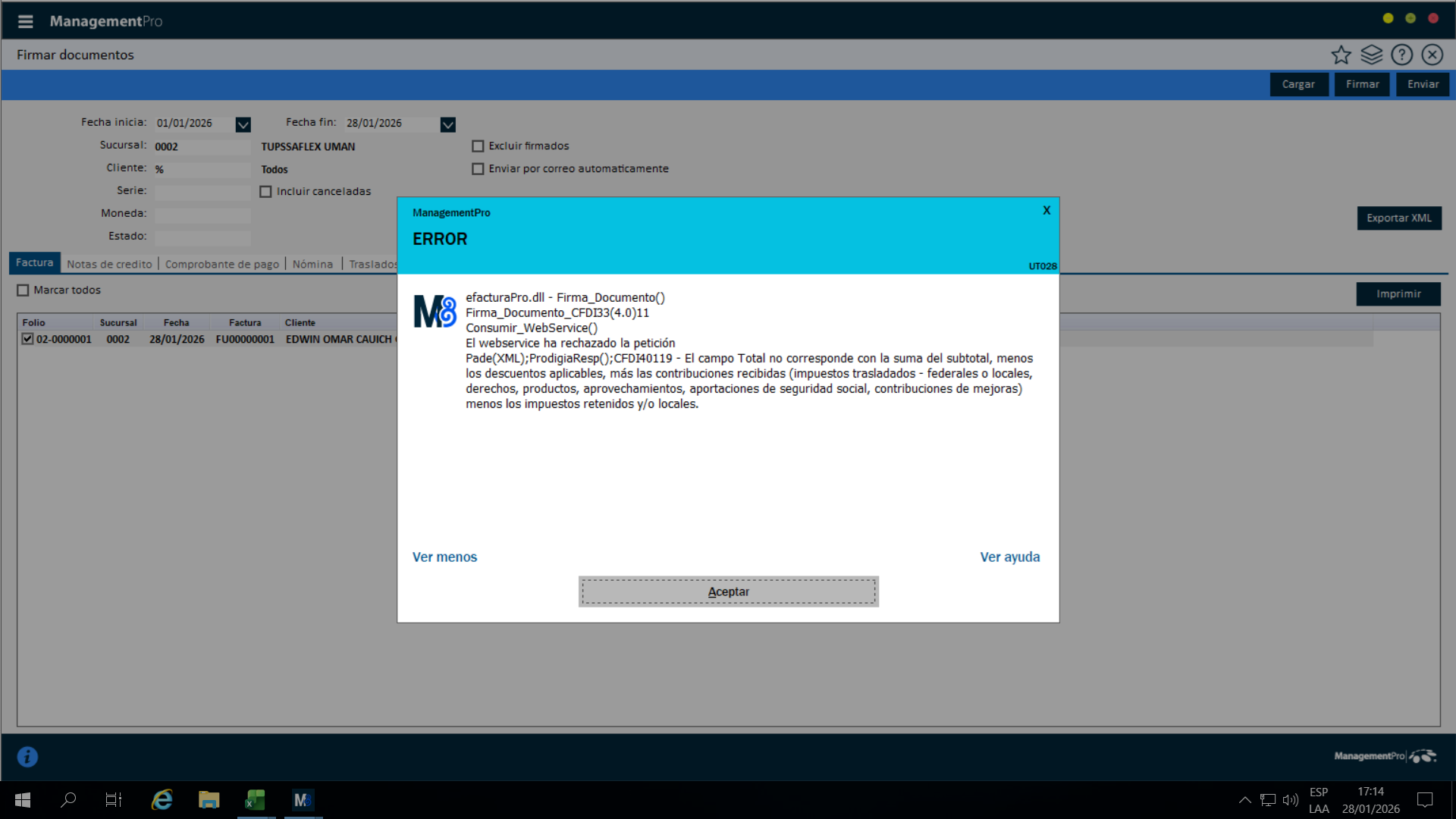 FACTURA NO TIMBRA POR DIFERENCIA EN TOTAL VS SUMAS TOTALES MAS IMPUESTOS