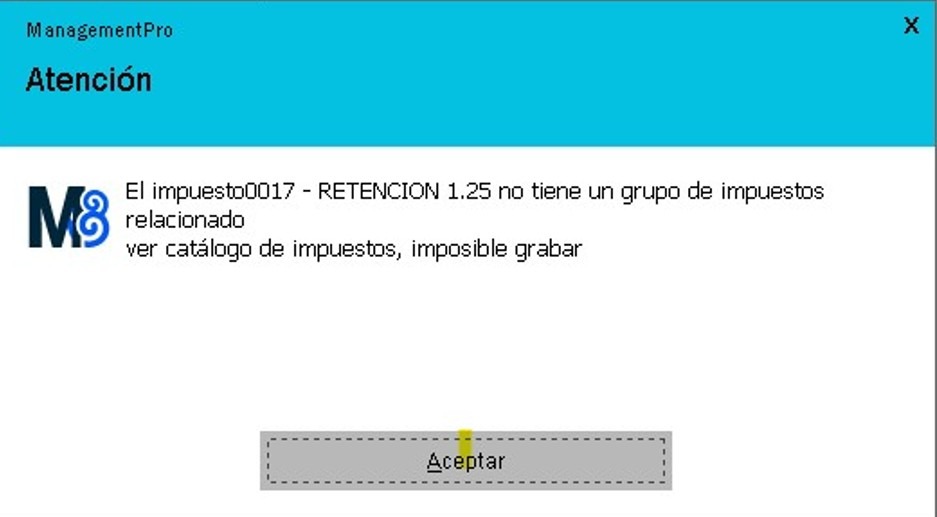 Al medio dia me hicieron favor por medio de una consultoría, dar de alta un Impuesto de retención del ISR de 1.25%, me hicieron favor de replicarlo a todos los productos, solo que al querer ahora dar alta a un producto y seleccionar esa retención de impuesto me marca error, adjunto imagen